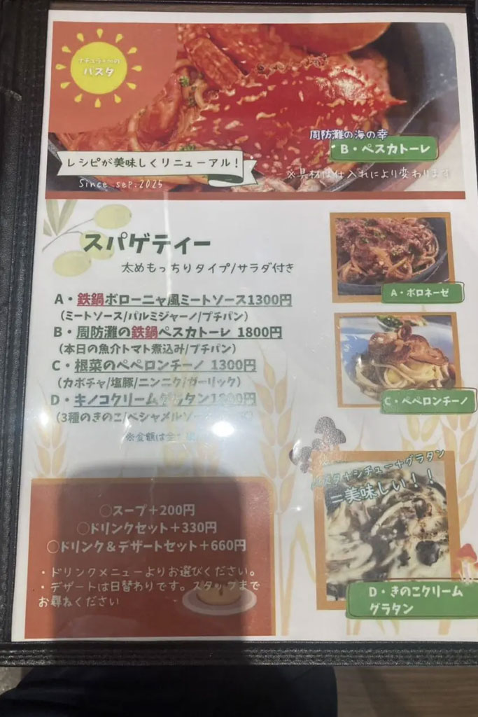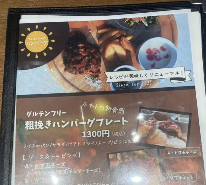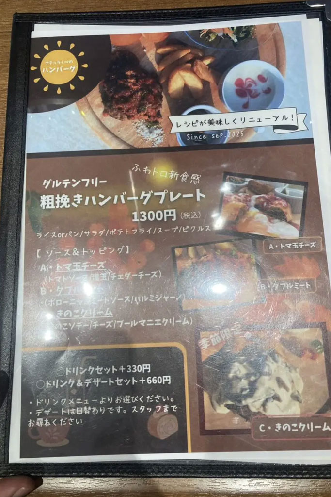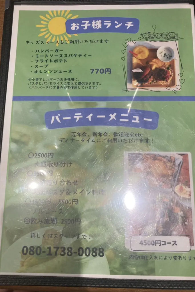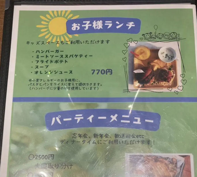 ハンバーグのワンプレートや、ピザやパスタまで揃い、子ども向けメニューもあります。
