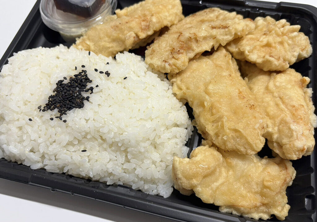 パックからはみ出すほどの豪快なボリュームが名物のお弁当店。