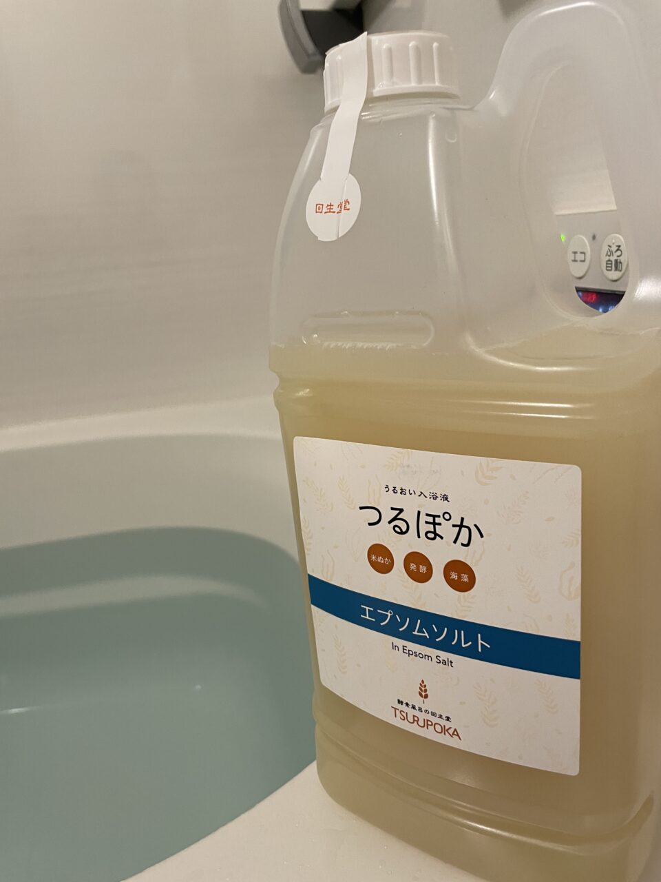 大分県民なら気になる「肌のつるつる感」と「温まり」を両立してくれるのが、米ぬかと植物を発酵させた液体入浴液「つるぽか」です。塩と同じく安全な中性で水溶性の結晶のエプソムソルト入りは更に温熱を高める効果も期待できます。